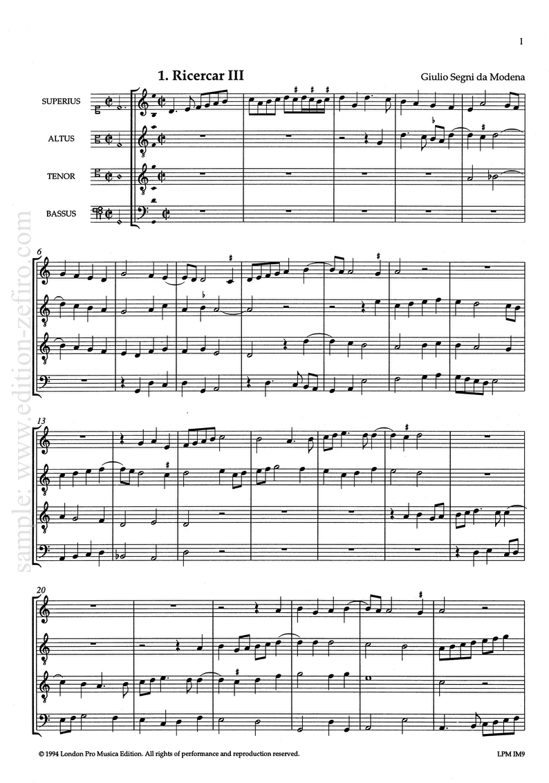 Giulio Segni, also known as Julius da Modena, was first organist at St. Mark’s, Venice from 1530 to 1533. An indication of the respect accorded to his music is the fact that several of them survive in intabulations for lute and keyboard. Certainly he shows a remarkable contrapuntal gift, and a special ability to compose melodies that unfold organically from a simple opening phrase, and which have exquisitely controlled climaxes.
