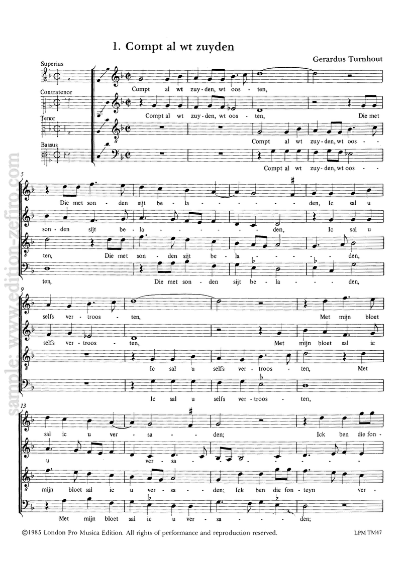 Phalèse’s anthology contains thirty- two songs, al with Dutch texts: there are works by Clemens non Papa, Lupus Episcopius, Lupus Hellinc, Jan Belle, Gerard de Turnhout and others. Some of the composers represented were living at the time (Gerard de Turnhout, for instance), but others, such as Clemens non Papa, had been dead for many years. In fact many of the pieces in the 1572 print seem to have been taken from an earlier publication…