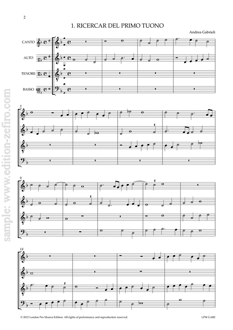Andrea Gabrieli’ seven 4-part ricercars come from a single source, his MADRIGALI E RICERCARI A Quattro Voci, published in Venice by Angelo Gardano in 1589. It is a posthumous collection, the composer having died in 1585, and it is thought that Andrea’s nephew Giovanni was responsible for seeing it through the press. It is interesting that the opening theme of the seventh ricercar, which is today so popular with brass players, was developed by Giovanni in his Canzon Septimi Toni a 8 (no. 6 in the present series). It is striking that both this and no. 5 in the present collection differ strongly from the remaining pieces: they are shorter, more extrovert, even public in character, and give the impression of being conceived specifically for wind instruments.