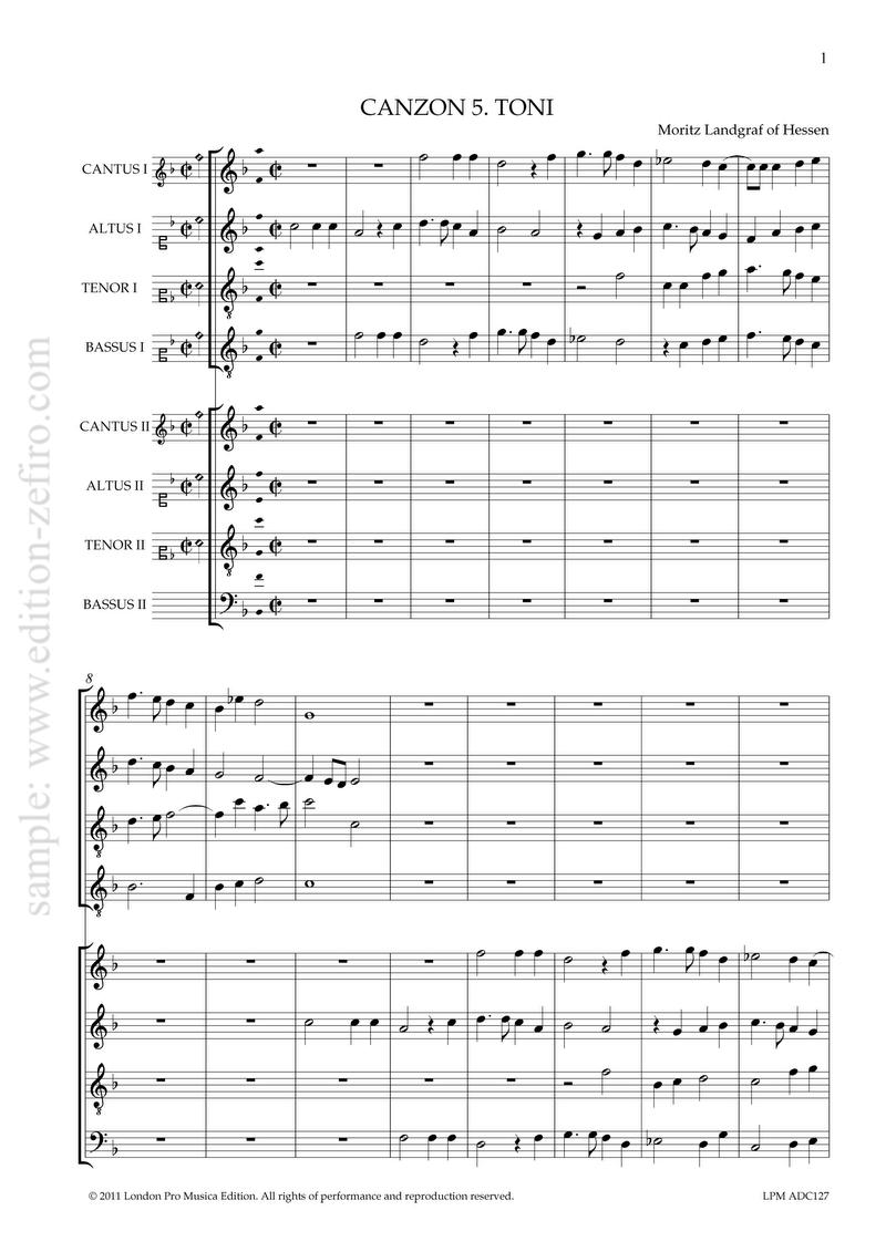 This work is taken from Ms 20 mus. 59s of the Landesbibliothek in Kassel. It is an attempt at composition in a North Italian style, though we doubt if many people would mistake it for a genuine Italian work. It has a certain attractive naiveté, a quality found in many of the pieces composed by Moritz Langraf of Hessen, who was sometimes known as “Moritz Der Gelehrter” (Moritz the scholar). An interesting feature of his music is that it often calls for specific instrumentation: there is an intrada for eight cornetti and eight “dolzani” (curtals), and the Kassel pavan collection (RB 11 ↣) contains pieces for four cornetti and five trombones and several interesting mixed combinations.