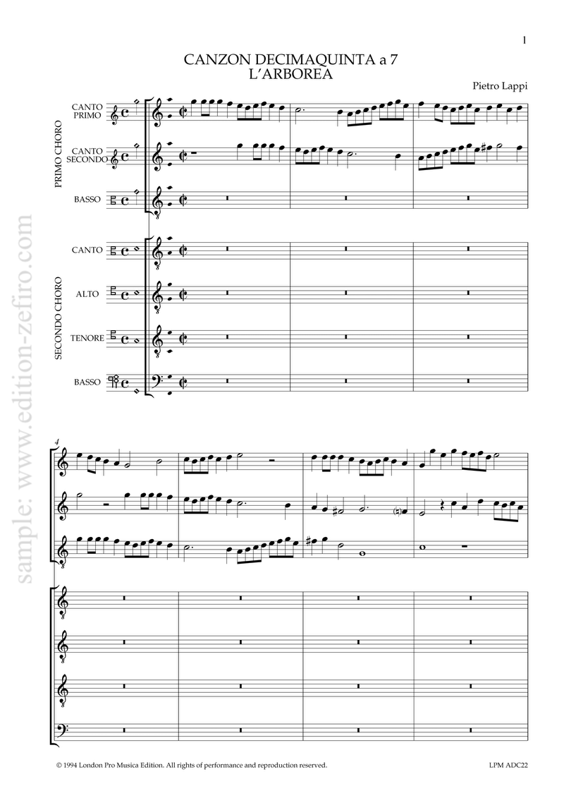 This collection is unusual in including pieces for every possible number of instruments between 4 and 13, also for the use in some pieces of very widely spaced ensembles. Stylistically the pieces are mostly rather conservative, avoiding complex harmonies and virtuoso figuration; nevertheless, they represent the work of an experienced church composer. Lappi worked at Brascia, a city known as a centre of violin making.