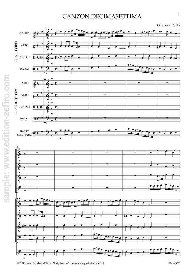 This is one of three double-choir canzonas in Giovanni Picchi’s Canzoni da sonar con ogni sorte d’istromenti. A Due, Tre, Quattro, Sei, & Otto Voci, con il suo Basso Continuo, published in Venice by Alessandro Vincenti in 1625.