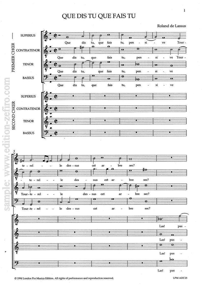 This is a setting of a poem by Ronsard. Although set in 2 choirs, it is not intended for separated choirs, as the bass is not always present in both choirs.