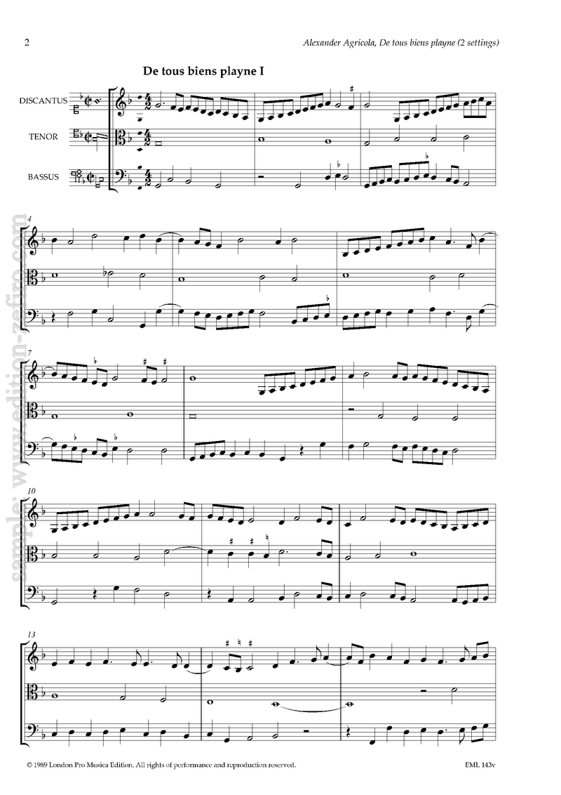 Agricola was a distinguished contemporary of Josquin des Prés, who composed in somewhat more ornate style. He wrote several instrumental versions of the 15th-century classic De tous biens playne; these two are quite virtuosic and brilliant.