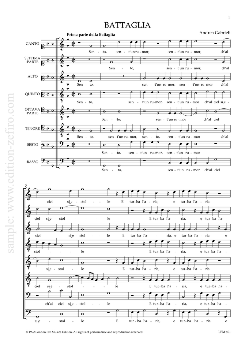 It is one of the most varied and colourful of the many battle pieces of the Renaissance, with much word-painting. Indeed there is a great deal more musical substance here than in the same composer’s purely instrumental Aria della Battaglia. There is some common material with Janequin’s La guerre, which seems to be the central piece in the whole battaglia repertoire.