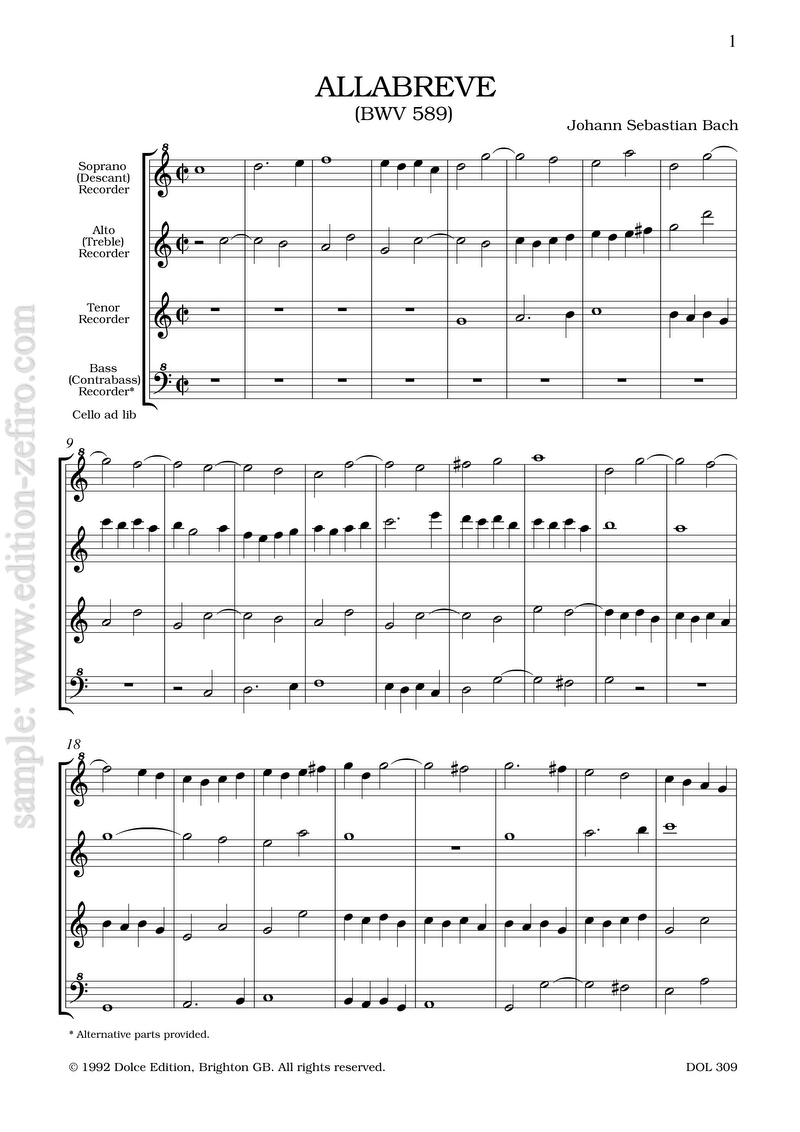 Originally in D major, it has been transposed down to C in this arrangement, which otherwise follows the original quite closely, with only an occasional passage in the bass part transposed up an octave. We have provided two alternative bass parts: one for normal bass recorder in F, the other for a contrabass in C.