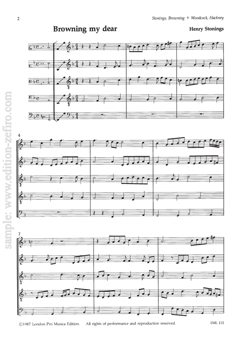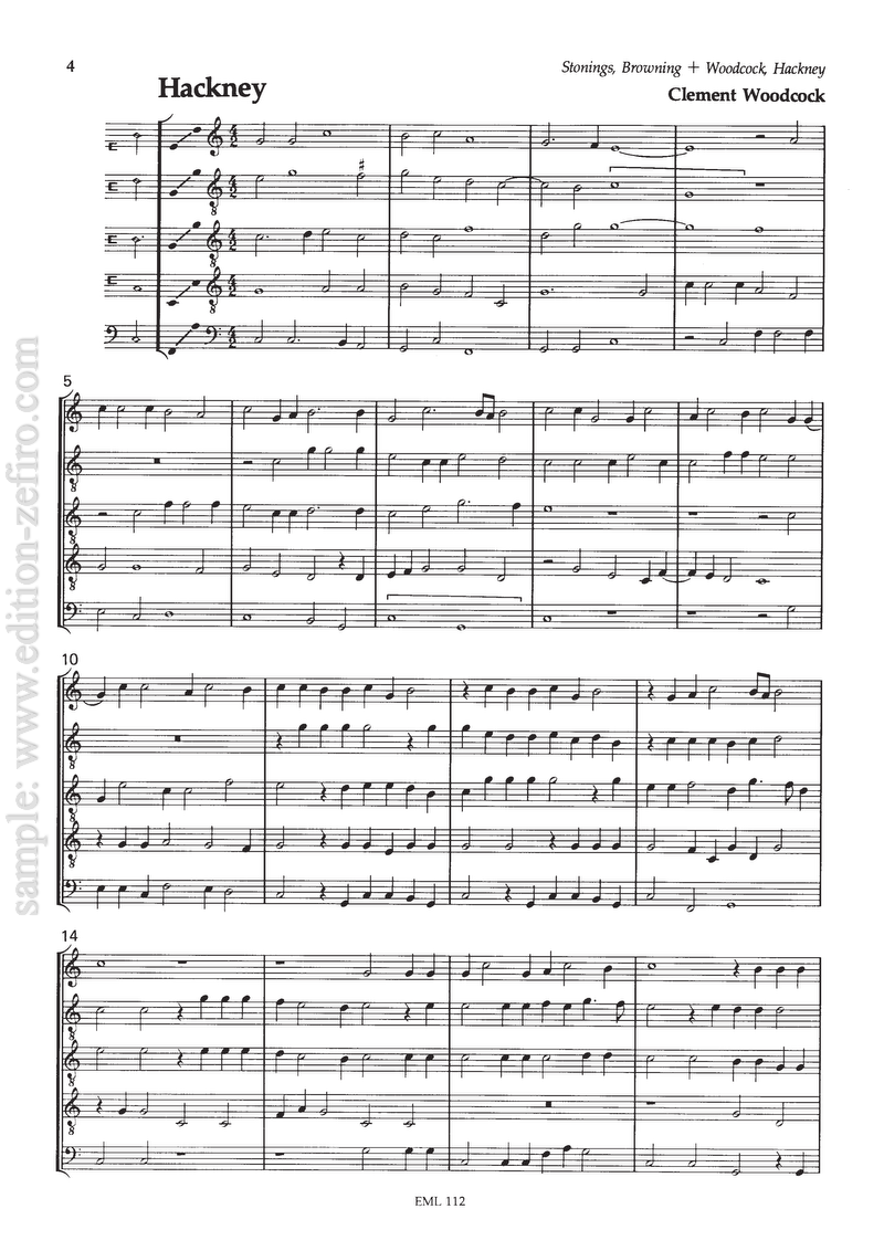 The song The leaves be green, also known as Browning, was a favourite theme for polyphonic elaboration, as in this setting by Henry Stonings. The other piece here, Hackney, is by Clement Woodcock, who composed one of the other Browning settings (see EM1↣). If you feel up to the ultimate, but highly complex version of this tune, you should try the setting by William Byrd (see EM21↣).