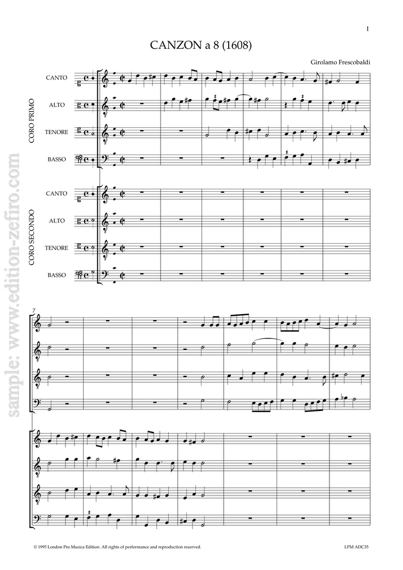 Category: Instrumental music. Tags: 1620, 2 choirs, 8 part, ADC, ATTB + ATTB, Canzone, Early Baroque, Girolamo Frescobaldi, Italian, Published 1608, SATB + SATB.