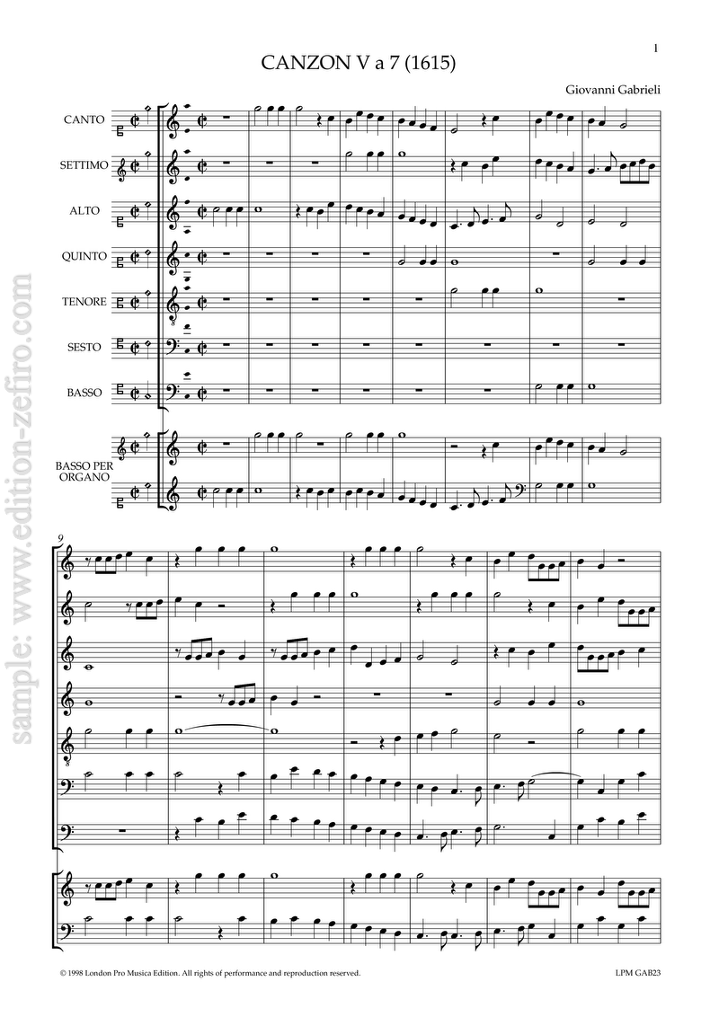 Category: Instrumental music. Tags: 1590, 7 part, Canzone, Early Baroque, GAB, Giovanni Gabrieli, Italian, Published 1615, SSSATBB.