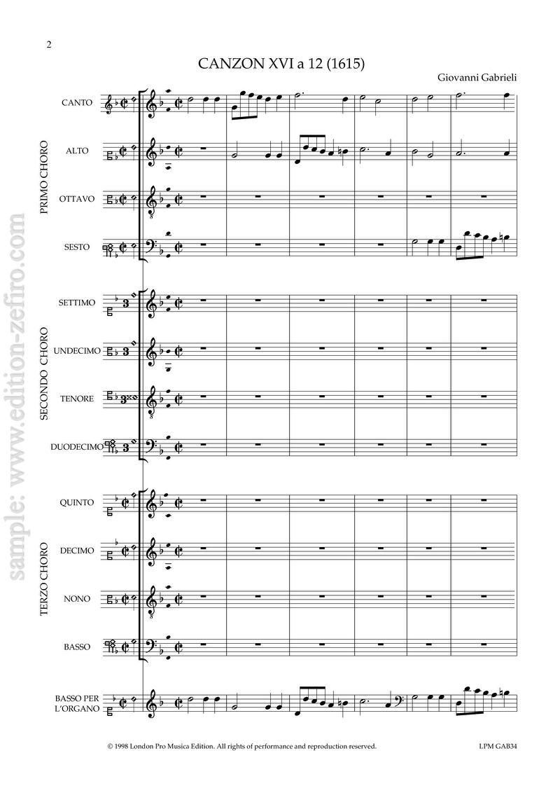Category: Instrumental music. Tags: 12 part, 1590, 3 choirs, Canzone, Early Baroque, GAB, Giovanni Gabrieli, Italian, Published 1615, SATB + SATB + SSTB.
