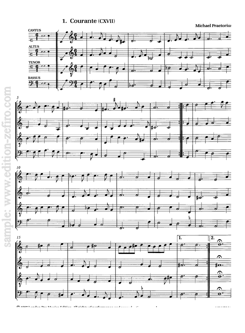 In most cases Praetorius had only the melody to go on, and simply added the remaining parts, but there is a small group of pieces labelled ‘incerti’ in the original, where Praetorius was also provided with a bass part, so only had to fill in the inner parts, a considerably easier task. However, there is also an important group of about 70 dances attributed to Francisque Caroubel, another French violinist who happened to visit Wolfenbüttel in 1610; here it seems that Caroubel was responsible for all the parts, though again in many cases the tunes would probably have been composed by other musicians.