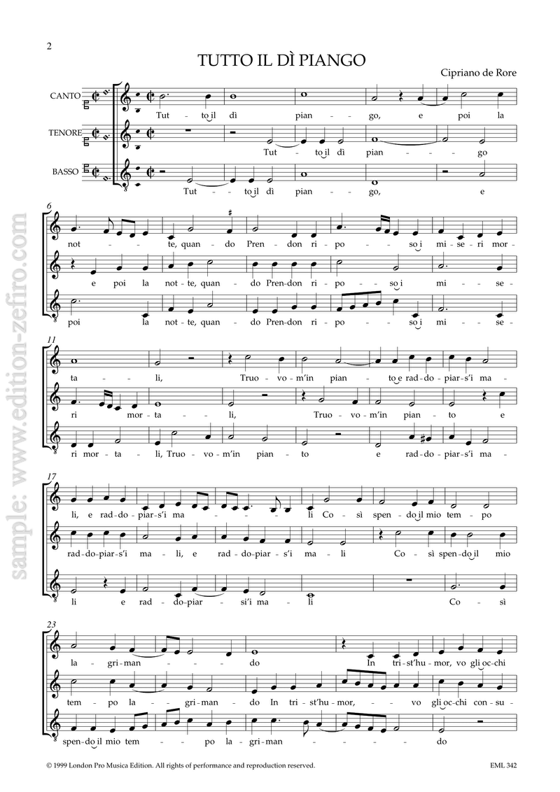 This madrigal, Tutto il dì piango by the Italian Cipriano de Rore (1516-1565) js one of just a few 3-part pieces by this master.