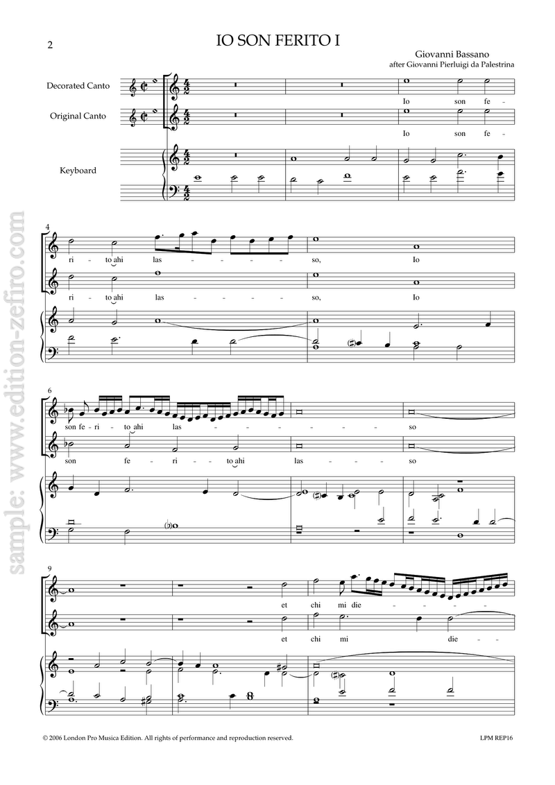 First published in 1561, Palestrina’s Io son ferito was one of the more widely-arranged pieces of its day. Like his Vestiva i colli, which was even more popular, it is a relatively conservative piece without any dramatic contrasts or intense word-painting; it is, however, precisely this aspect of the work that made it a good starting-point for improvisation. As well as the divisions included here, there are several other surviving arrangements, including a magnificent keyboard fantasia by Samuel Scheidt, (Tablatura Nova) and a duo in