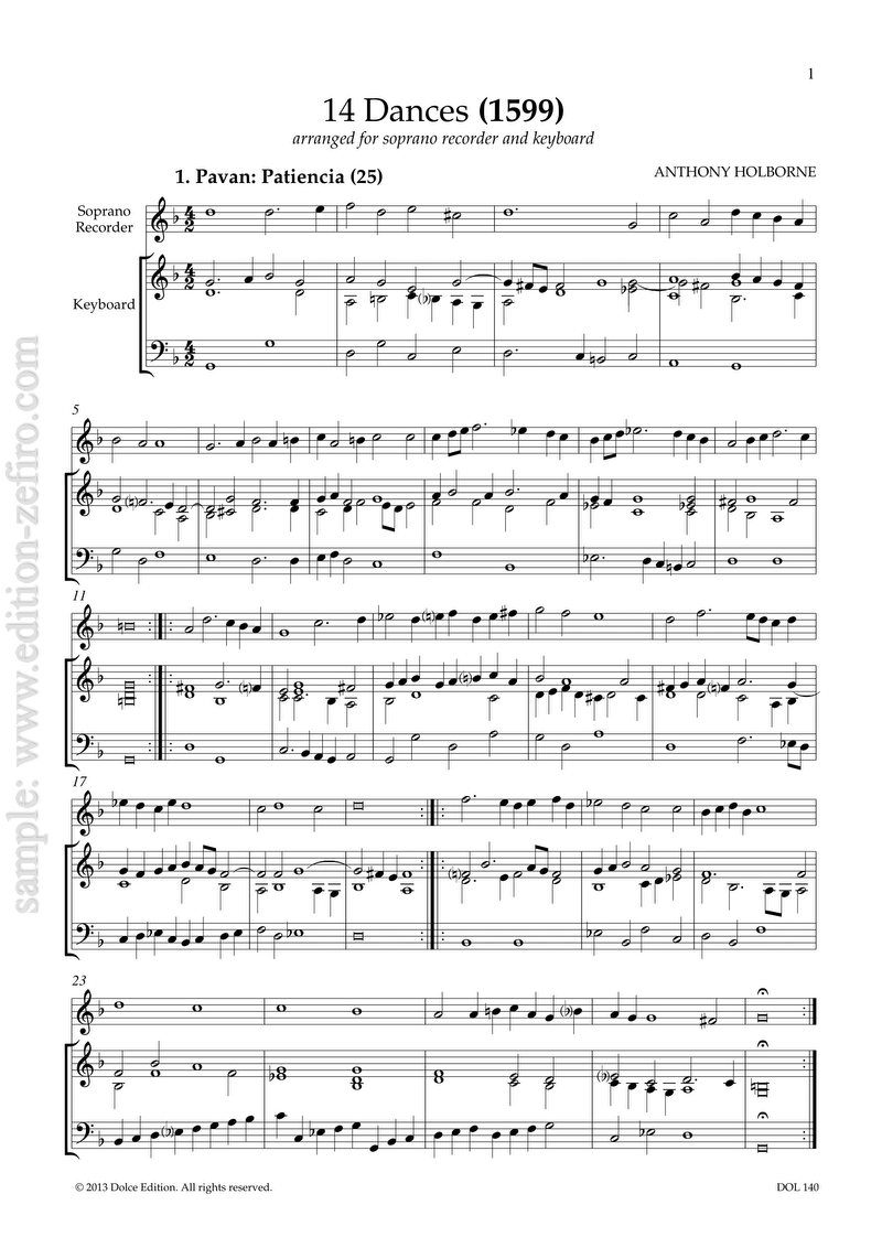 Anthony Holborne’s Pavans, Galliards and Almains of 1599 contains 63 more or less stylised dances, arranged in five parts. Holborne, like his contemporary John Dowland, was essentially a player of plucked instruments such as the lute and bandora. The partwriting of both these composers is quite different from that of organists such as Byrd and Gibbons; it is much less contrapuntal, and designed to deliver harmony and texture. In Holborne’s case the fourth part (labelled tenor) is quite redundant at times. Often what we find in his music is essentially tune and bass, with impressionistic riffs in the middle of the texture. In other words, his music can be rearranged, as we have done here in these versions for solo recorder and keyboard. Please feel free to adapt these arrangements further to suit your own purpose.