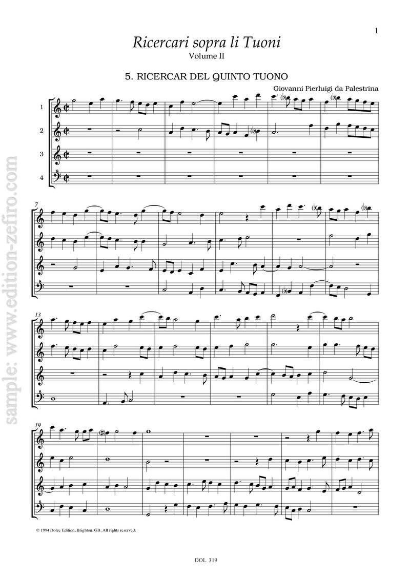 In this two volume edition nos. 1 and 4-7 have been transposed down a fourth, so that they can all be played on the ATTB combination (ideally with a G instrument on the top) that is best for this kind of music. However, an additional set of parts (labelled “high version”) have been supplied at a pitch a fourth or a fifth higher: these can be used either for SAAT or SSAT, or alternatively an octave lower, for TBBCb/TTBCb/ATBCb