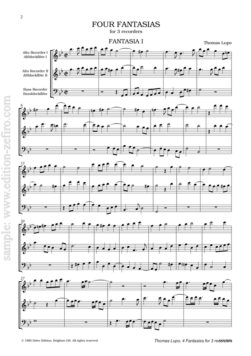 The pieces are one of a group of Lupo fantasies with a rather distinctive scoring, with two top parts of violin range, and a bass part that is on average almost two octaves lower. The style of the music is also different from Lupo’s more conventional 3-part fantasies, being a little more Italianate, and generally fairly light in character. In arranging these pieces for recorders, I have transposed the music up a fourth, but adapted the bass part so that it will fit easily on a bass recorder, and does not move too far away from the top parts: this has resulted in a a series of minor changes too numerous to list here (a critical edition of Thomas Lupo’s three-part instrumental music was published by Boethius Press). The bass part can of course easily be played on an 8-foot instrument such as viola da gamba, cello or dulcian (curtal), if the bass recorder is found to be too weak.