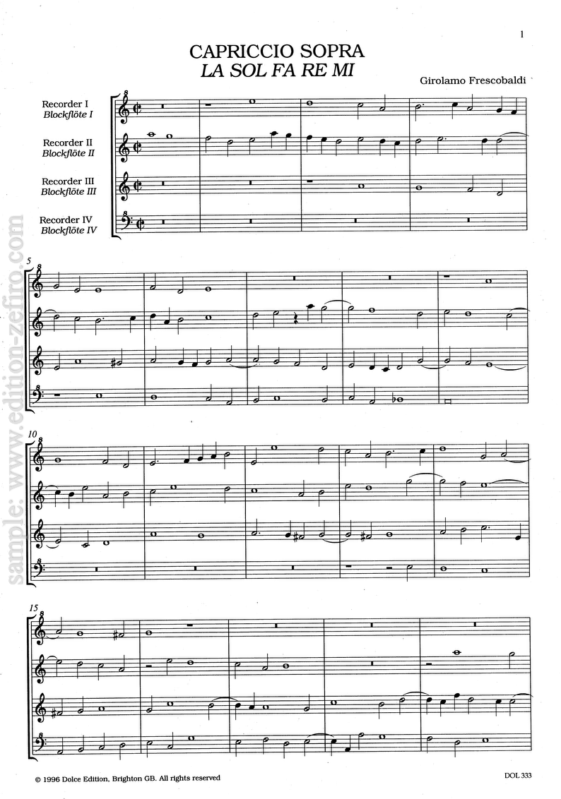 This collection, although primarily intended for keyboard, was published in score on four staves, and most of the pieces actually work very well as ensemble pieces. As the title suggests, many of the works are based on a single idea or tune: there is a capriccio built around the two notes of the cuckoo, another round the five-note La Sol Fa Re Mi (A-G-F-D-E) that was treated by so many composers from Josquin onwards and yet another on the popular Spagnoletta melody (DOL323 Spagnoletta ↣).