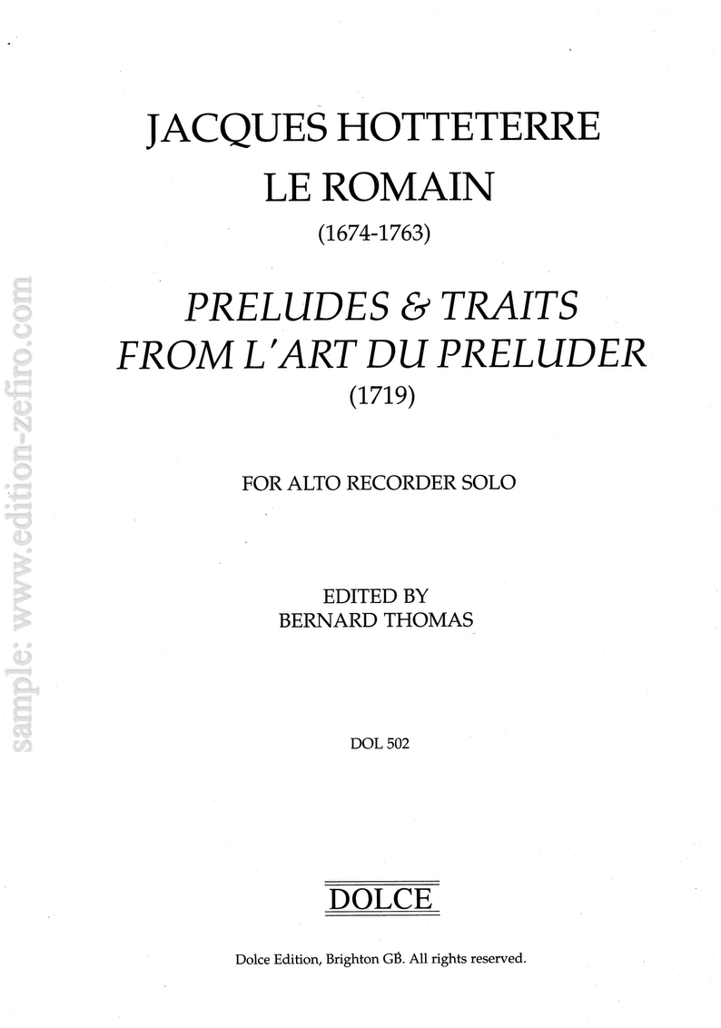 Hotteterre’s L’art du Préluder (Paris 1719) consists mainly of sets of preludes and traits in all keys. Chapters 3 and 4 consist of preludes and traits intended primarily for flute; some of these are marked as being playable on the recorder, but actually tend to lie a little too low for comfort, and recorder players are better off turning their attention to the preludes and traits found in chapters 5 and 6, which are specifically for the recorder, and which appear in their entirety here.