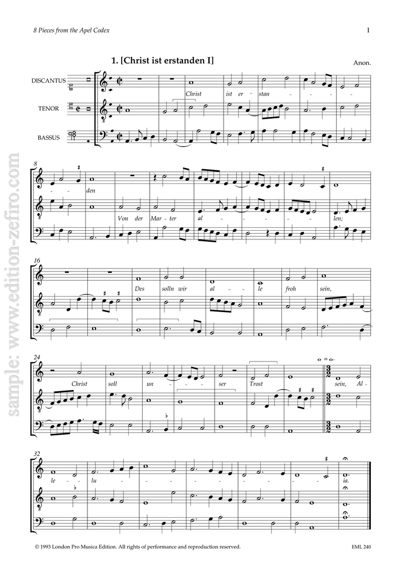 Eight Pieces from Apel Codex contains settings of plainsong hymns and the song Christ is erstanden in a rhythmically virtuosic style.