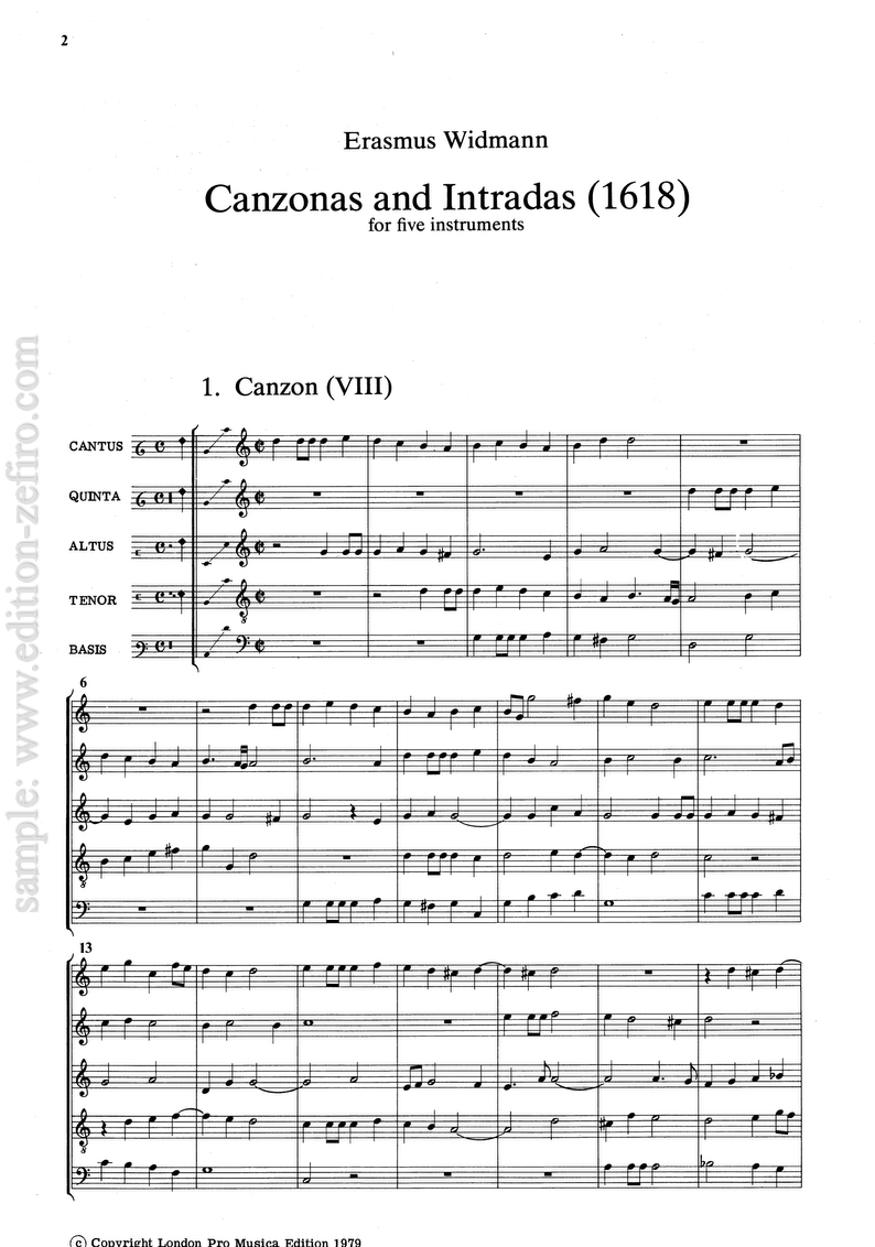 Widmann’s pieces, in common with those of many German musicians of his time, seem to be heavily influenced by Italian music of twenty or so years back from the publication of his collection. He shows no knowledge of the Italian avant-garde of his own day, for instance of the solo sonatas of Cima, which appeared in 1610, or even of the late works of Giovanni Gabrieli, who died in 1612. Indeed if we compare his intradas with those of Alexander Orologio, whose collection of 1597 contains the earliest surviving examples of the form, it is hard to detect any real stylistic advance, except that Widmann’s seem to be written with string instruments in mind, Orologio’s with wind. Some of widmann’s canzonas, notably no 3 in the present collection, resemble in many respects the earliest pieces of Giovanni Gabrieli and of other north Italian composers active around 1590.