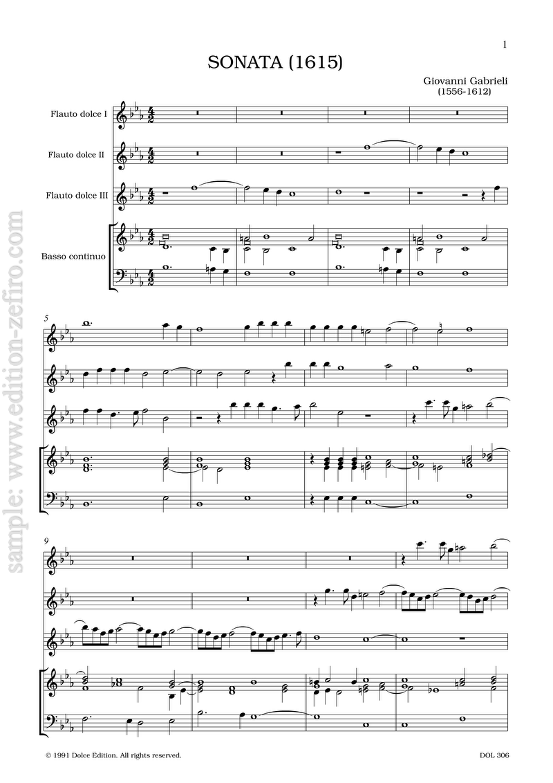 Giovanni Gabrieli’s Sonata con tre violini appears at the end of his magnificent posthumnous collection of 1615, the Canzoni e Sonate. To bring it into the range of normal alto (treble) recorders in F, I have transposed the music up a minor third. Of course it can be done on other sizes of recorders, by reading as if for F instruments, provided the continuo players can make the appropriate transposition: for instance, a tone higher on G altos – the most likely choice in Gabrieli’s own time or a fourth lower on tenors.