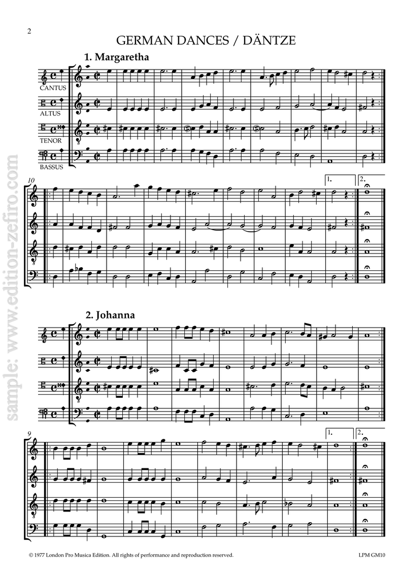 Those in this little volume are taken from his Musicalscher Tugendtsiegel, which was published in 1613 in Nürnberg. The entire collection contains 20 five-part texted dances (they can either be sung or played) as well as the 20 4-part pieces without text printed here, all of which carry girl’s names of the time.