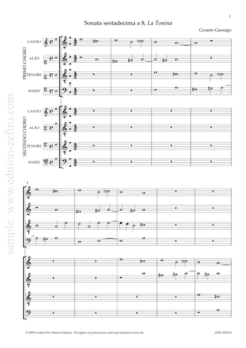Printed after Gussago’s Sonate a 4. 6. 8. con alcuni Concerti a Otto, con le sue Sinfonie da suonare avant… (published in Venice in 1608). While the other pieces are scored for high and low choirs, or for two equal choirs, La Tonina opts for a somewhat different solution, in which one choir is slightly lower than the other, while often imitating material at the same pitch. The temptation is to wonder whether this unusual scoring was chosen with particular instruments in mind, presumably a string choir for choir I and a wind choir for the slightly lower choir II. Gussago worked in Brescia, the leading centre at that time for violin making, and in fact Gussago’s collection was dedicated jointly to the famous violin player and composer Giovanni Battista Fontana, and to the (less famous) cornetto player Ludovico Cornale.