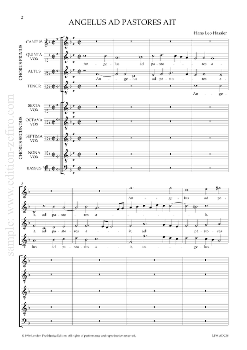 This Christmas motet comes from Hassler’s Sacri concentus, of 1610: it is a setting of a text that had been previously been set by Hassler’s teacher Andrei Gabrieli. The layout, in nine parts, is somewhat unusual, though conventional in having the high first choir that one usually finds associated with angels.