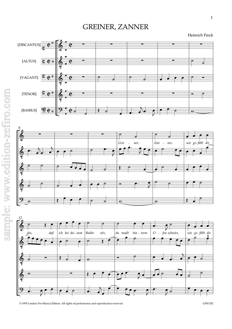 This 5 part piece, Greiner, Zanner, by Heinrich Finck (1445-1527) survives in two very closely related manuscripts (both written by Lucas Wagenrieder), MS mus. 18810 of the Österreichische Nationalbibliothek, and MS 328-331 of the Universitätsbibliothek in Munich. The Munich source does not include the Vagant; however this part does not give the appearance of an added part, containing quite a few essential phrases.