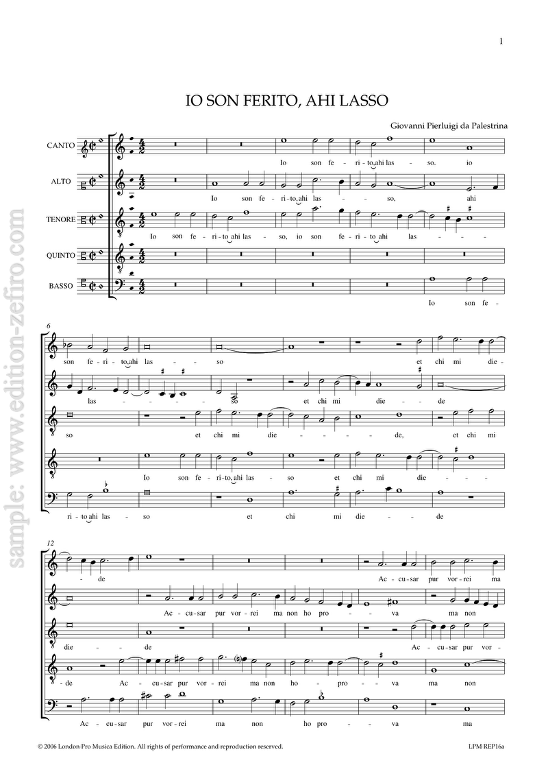 First published in 1561, Palestrina’s Io son ferito was one of the more widely-arranged pieces of its day. Like his Vestiva i colli, which was even more popular, it is a relatively conservative piece without any dramatic contrasts or intense word-painting; it is, however, precisely this aspect of the work that made it a good starting-point for improvisation.