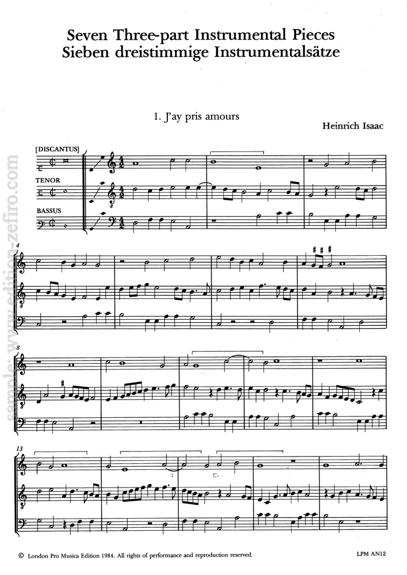 These are very varied pieces, ranging from the beautifully melancholy La Morra and a delicate setting of J’ay pris amours. (Score and parts)