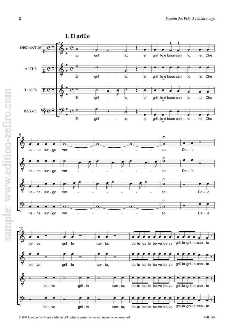 El grillo is a comic song composed to remind his employer in Milan that he, Josquin des Prés, was owed money: “the cricket lives on air, and doesn’t need money,” etc.