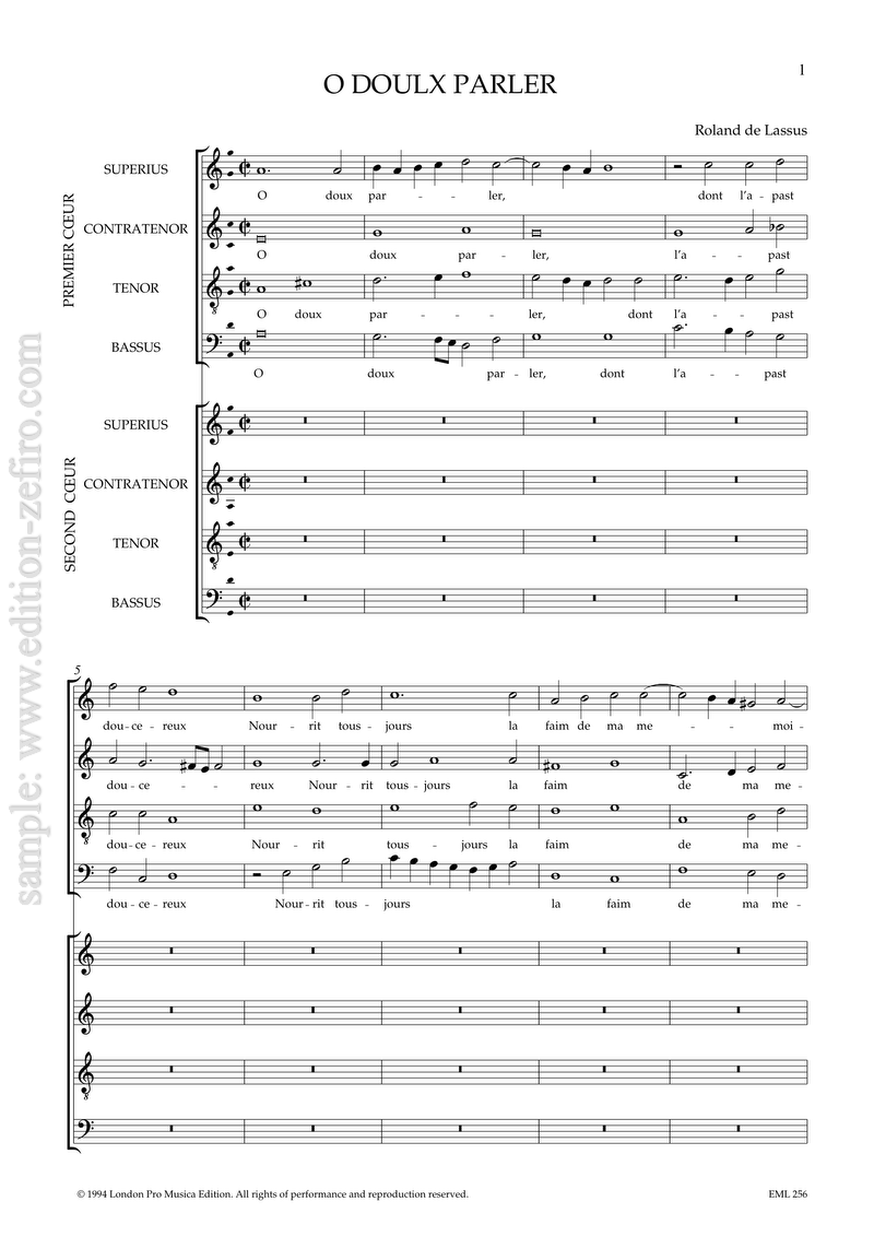 Although set in 2 choirs, is not intended for performance by separated choirs, as the lowest part of one of the choirs does not necessarily have the real bass.