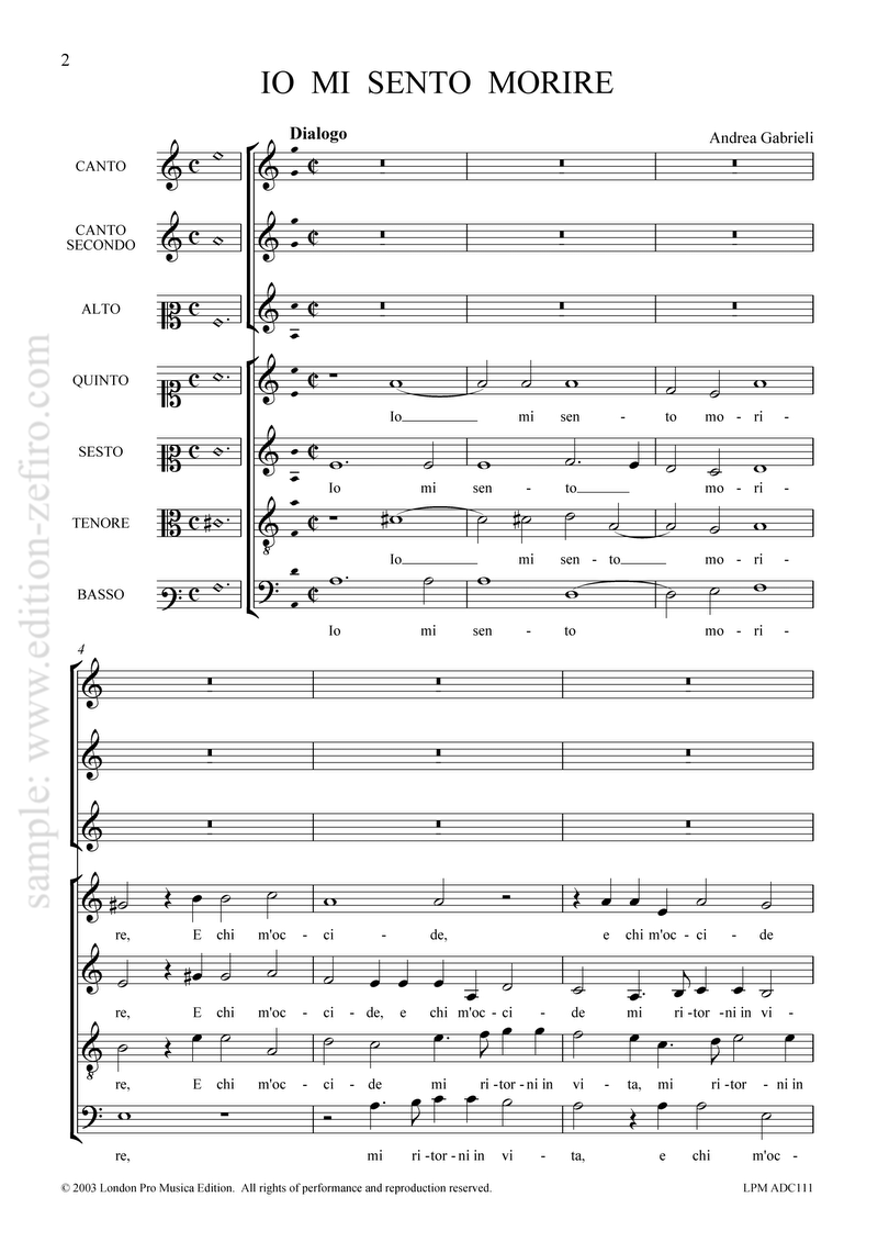 Andrea Gabrieli’s Dialogo “Io mi sento morire” is one of three 7-part madrigals printed after the Concerti di Giovanni e Andrea Gabrieli, (Venice 1586). Although the work is clearly antiphonal in character, the division between the groups of voices is not rigid – often the three upper voices are joined by a fourth voice from the lower group, and not always the same one. This has practical implications for performance, suggesting that all the performers would have occupied a single space, rather than being in cori spezzati in different galleries; it was in any case mostly churches that had the galleries for divided choirs, and this piece is not at all suitable for performance in a church, being quite openly erotic.