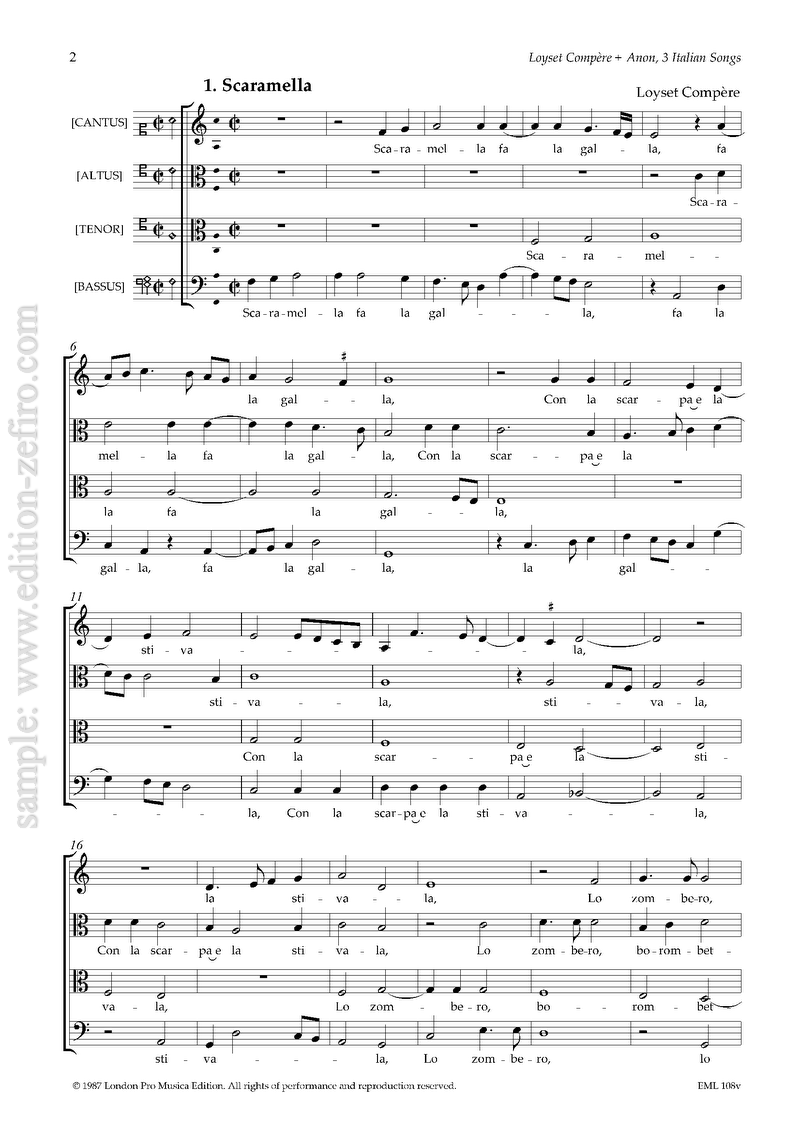 Like most Northern European musicians, Loyset Compère spent some of his working life in Italy, and applied his considerable contrapuntal skills to the two popular songs Scaramella (familiar to many from the version by Josquin des Prés) and Che fa la ramacina. Our little publication also includes an anonymous setting of the second of these.