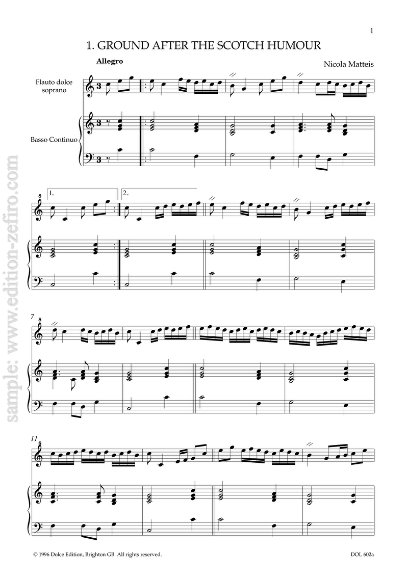 Although the majority of Matteis’ pieces were obviously intended for the violin, some are headed “for the flute” (recorder), including number 6 in the present selection. Not surprisingly, these are simpler in style than the violin pieces.