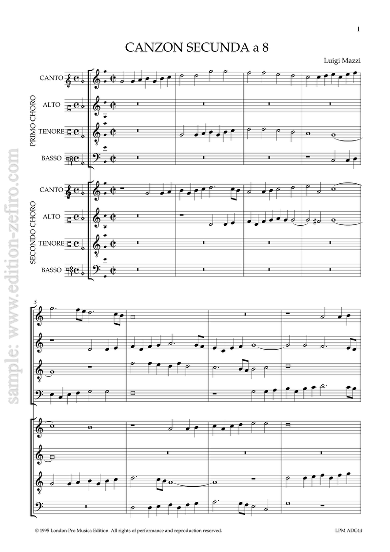 Printed after Luigi Mazzi’s Ricercari et Canzoni a quattro, a cinque, et a otto voci, Venice, 1596.