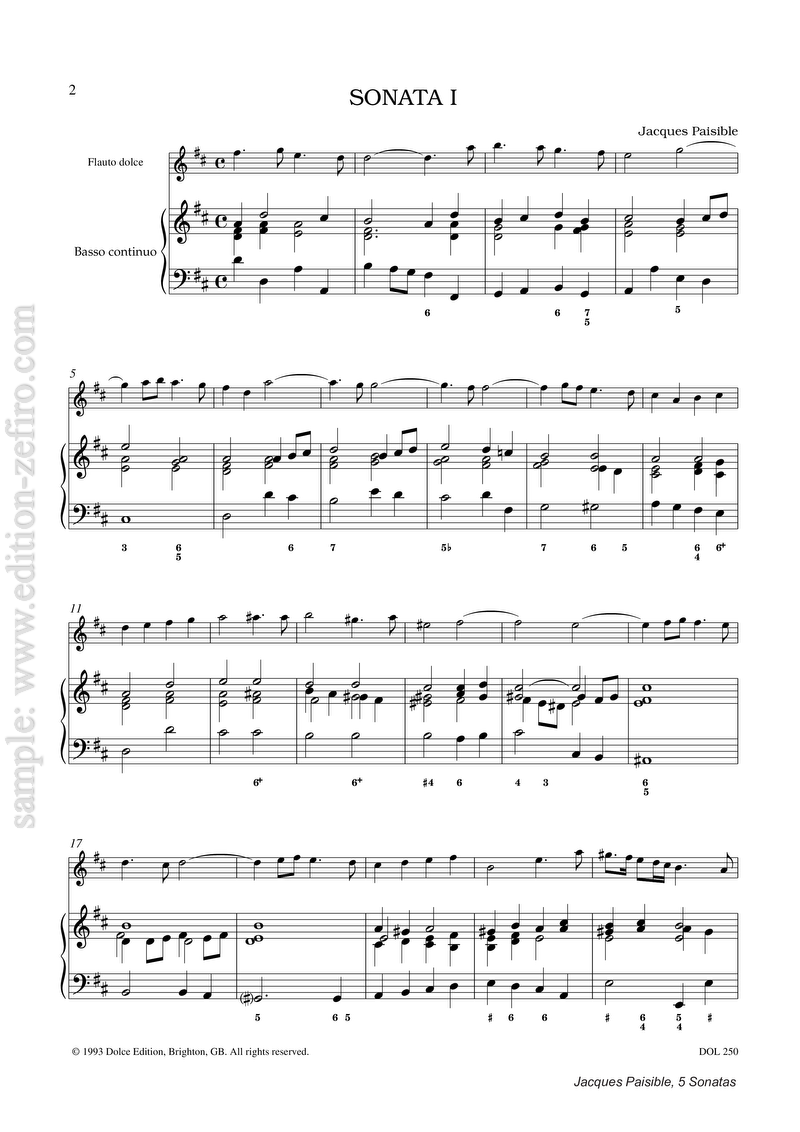 Jacques Paisible (James Peasible) was born about 1656 in, or in the neighbourhood of Paris. Various members of his family were employed at the court of Louis XIV — Louis Paisible is listed as “joueur de cromorne” in the Grande Ecurie, and Guillaume Paisible was a page in the Chambre du Roi. Jacques was probably educated musically at the court and, as was then customary, was given tuition on wind and string instruments. It is possible that Paisible came to England, together with R. Cambert and other French musicians, in 1673, although the first English reference to him is in connection with Crowne’s masque “Calisto”, which was performed in 1675 in Whitehall. Paisible and three other French musicians played the oboe and recorder parts, and it could well be that this was the first time that English theatre-goers heard the new Baroque wind instruments recently imported from France. These instruments must have met with immediate approval, as very soon a number of recorder tutors appeared on the market, and eminent composers like Henry Purcell and John Blow began writing for the instrument. Within a short space of time Paisible was established as composer for the court and the theatre. His output was in the French style, it being the fashionable court style of the time. In the theatre Paisible worked as a cellist, but he made his greatest impact as a recorder player in public concerts, appearing with J. Banister, P. la Tour, Fr. Dieupart and G. Visconti amongst others. When the Royal Academy of Music was founded in 1695, Paisible, together with Banister and Demoivre, was one of the teachers for recorder. In 1686 Paisible married the one-time mistress of Charles II, the actress and singer Mary (Moll) Davis. Mary’s illegitimate daughter, Lady Mary Tudor, probably lived with the Paisibles until her own marriage. In 1687 Paisible became an English subject, but at some stage between 1688 and 1693 he must have returned to France. Perhaps he accompanied James II, fleeing from the Protestants, to Paris. In any case he had to apply for a passport to enable him and his family to re-enter England.