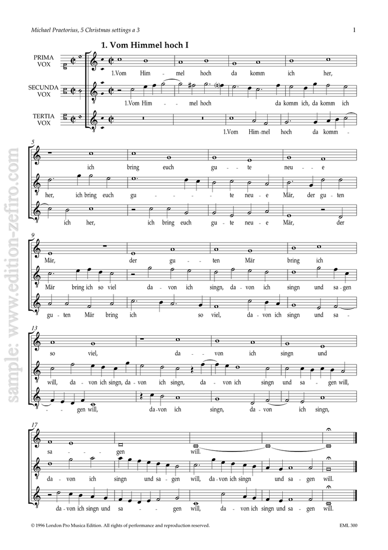 These 3-part Christmas hymn settings which include Puer natus est, Vom Himmel hoch, and In dulci Jubio are quite contrapuntal and elaborate.