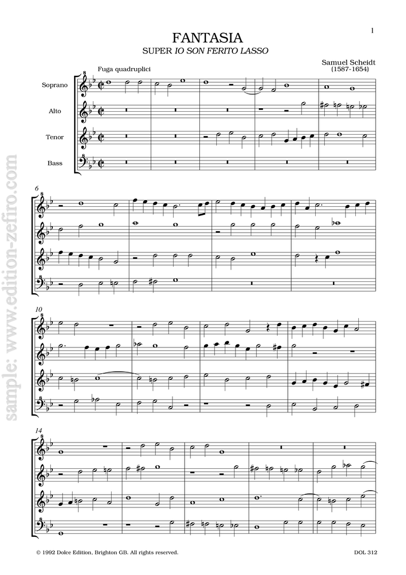 This magnificent fantasia comes from Scheidt’s Tablatura Nova, a varied collection of keyboard music set in score, published in Hamburg in 1624. Palestrina’s madrigal, Io son ferito lasso, on which it is nominally based, was popular with Italian musicians of around 1600 as a starting point for improvisation: there are elaborately decorated versions by Bassano, Bovicelli, Francesco Rognoni and Orazio Bassani. In fact only the first of Scheidt’s four themes comes directly from Palestrina, though the second is achieved by reversing the first. The third and fourth themes are chromatic, with one ascending, the other descending; such themes are found in several substantial works by Scheidt’s tacher, Jan Pieterszoon Sweelinck. During the course of the work Scheidt introduces new contrasting themes, for example bar 26 alto, bar 48 tenor, bar 56 bass, bar 64 soprano; often these slightly busier figures are set against one of the main themes in augmentation (double note values). Towards the end Scheidt increases the pace by presenting the chromatic motive in diminution, first in halved note values (bar 106), then in quartered (149). The work ends with a richly-worked section in which all four themes appear together.