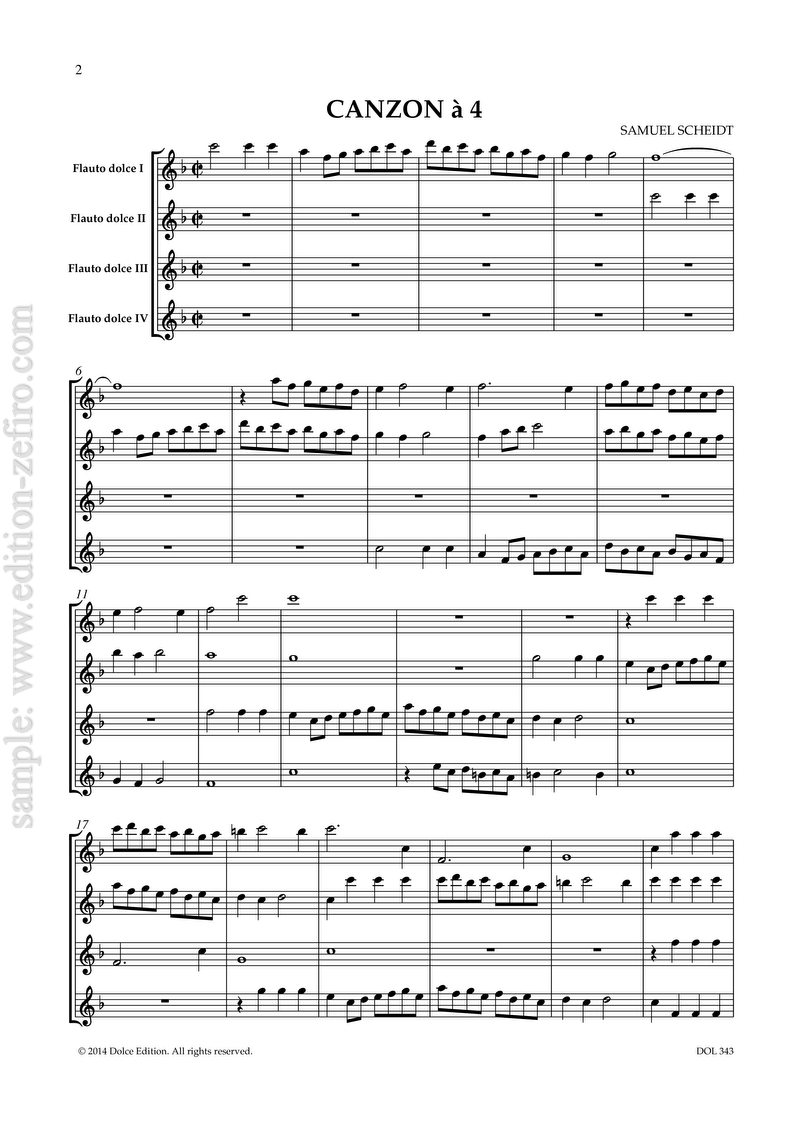 This unusual work is taken from Samuel Scheidt’s Ludi musici of 1621, where the four parts are labelled “cornetto”. The piece has appeared in some modern editions under the title “Canzon Cornetto,” which is a misreading of the source. There were a few pieces circulating in Germany for multiple cornetti, including an intrada by Moritz Landgraf of Hessen for four, and a canzona for six by a certain Lichtlein.