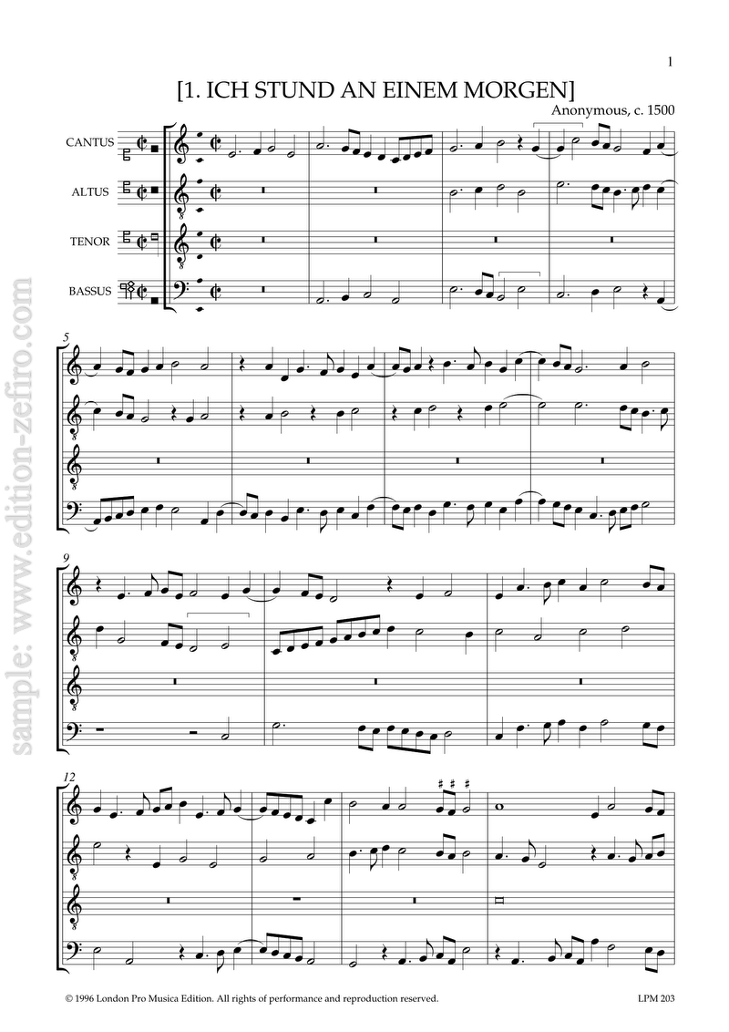 The original purpose of these pieces is not entirely clear: obviously the titles are not real titles (they are mostly found only in the index, anyway), but simply a provisional way of identifying them: many pieces of this time that appear with solmization titles are simply songs for which the texts were lost. The exception of course is Ich stund an einem Morgen, where we have a well-known melody in the tenor: even here the treatment is quite different from most surviving settings, presenting only the first phrase in the tenor. Either this is a genuine instrumental piece, or possibly a movement from a lost mass based on the tune. The same applies to two other pieces (2 and 3), which also have a very slow-moving tenor.