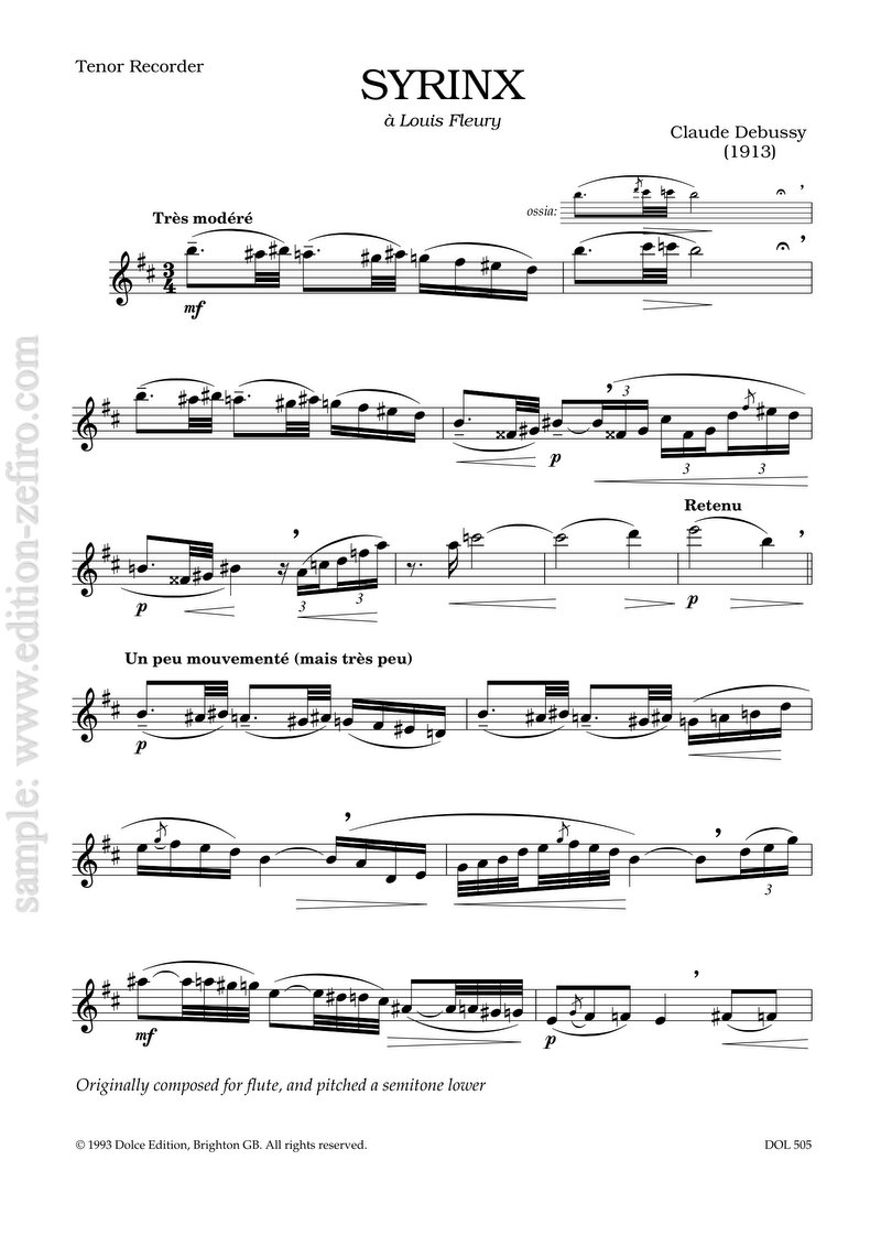 For solo recorder (alto / tenor). This classic of the flute repertoire transfers surprisingly well to the recorder, as fans of Walter van Hauwe and Piers Adams will know. Especially effective on a good tenor. It was originally intended to be played offstage.