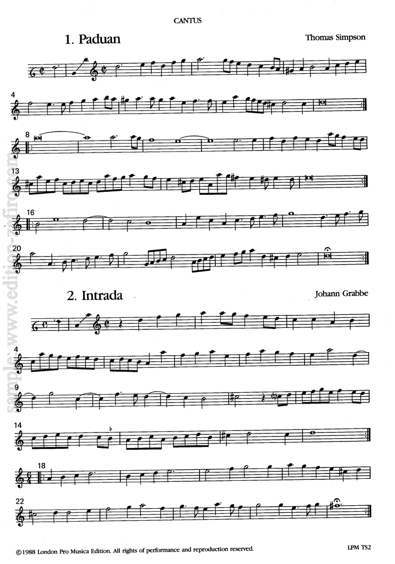 Thomas Simpson (1582 – c.1630) was one of several English musicians who found northern Germany a more promising working environment than his own country; of the others the most notable was perhaps William Brade. The earliest reference to Simpson’s professional activity is found in the court records of the Elector Palatine at Heidelberg in 1608; the title page of his Opusculum of two years later describes him as a “Violist”, which does not necessarily mean a viol player. But at some stage he moved further north, for from about 1615 to 1621 he worked at Bückeburg (near Hannover) at the court of Count Ernst of Holstein-Schaumburg, who was an important patron of music; in the years leading up to 1621 this maecenas figure also had in his orchestra William Brade, who joined in 1617 together with his talented pupil Nicolaus Bleyer, as well as another talented Englishman, Maurice Webster, who apparently played the lute. Two of the German musicians who feature in Taffel-Consort also worked at Bückeburg, the gifted Johann Grabbe, who had the distinction of having studied with Giovanni Gabrieli at Venice, and the less famous Johann Krosch.