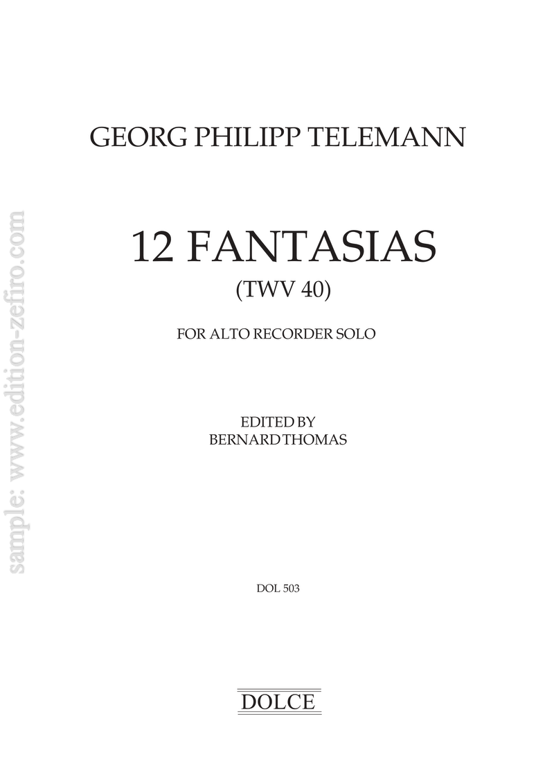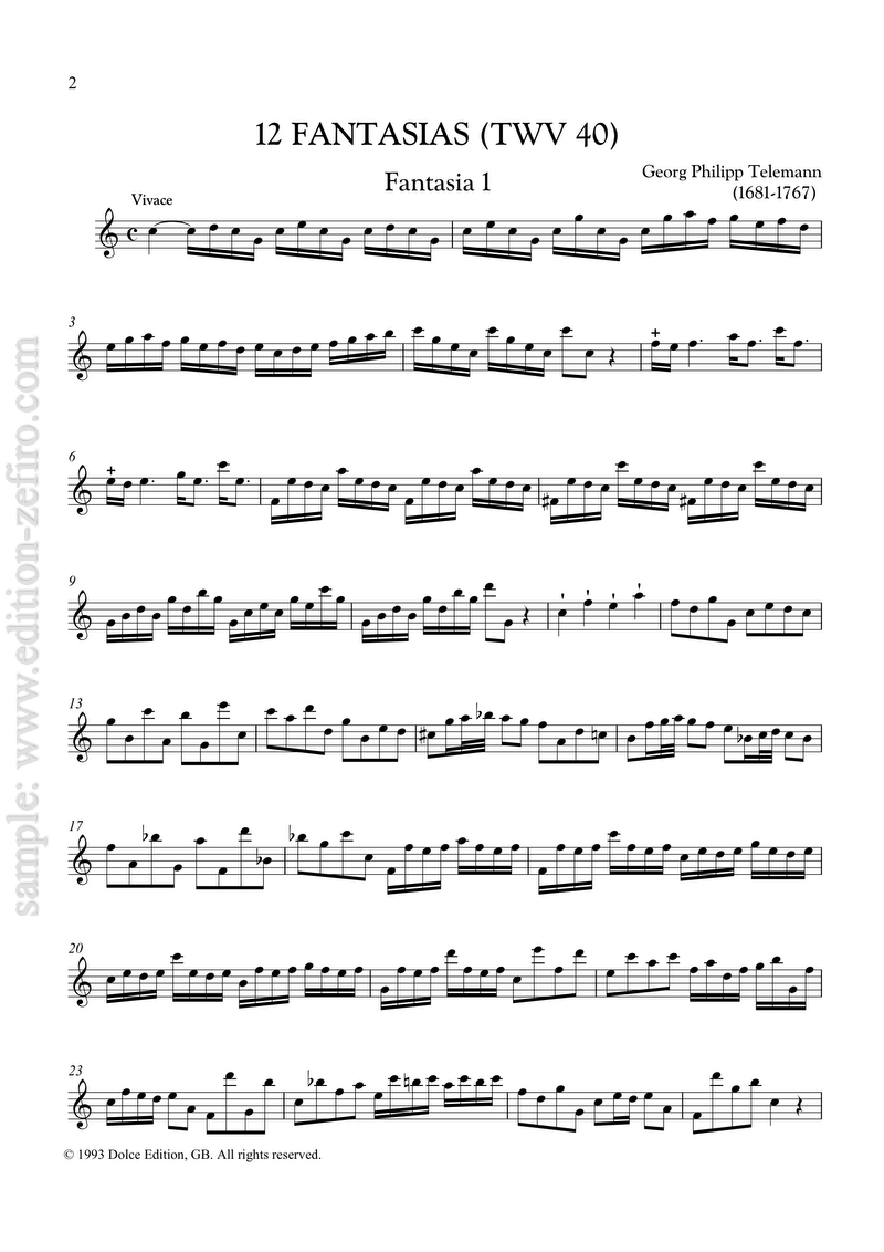 The source for these pieces is one of Telemann’s own attempts at publishing, a very crudely engraved print, preserved in the Bibliothèque du Conservatoire in Brussels probably printed around 1727-8, between his earlier works set with movable type, and before the more elegantly engraved music in Der getreue Music-meister of 1728. The title page is headed “Fantasie per il Violino senz Basso”. However, in Telemann’s autobiography he mentions 12 fantasias for transverse flute. As the other set of unaccompanied fantasias by Telemann (TWV 40/14-25), which really are for violin are full of double-stops, have even wider leaps, and make full use of the bottom string of the instrument, we do not have to take the heading for the present pieces too seriously, especially as it is in a different hand from that of the titles to the individual pieces.
