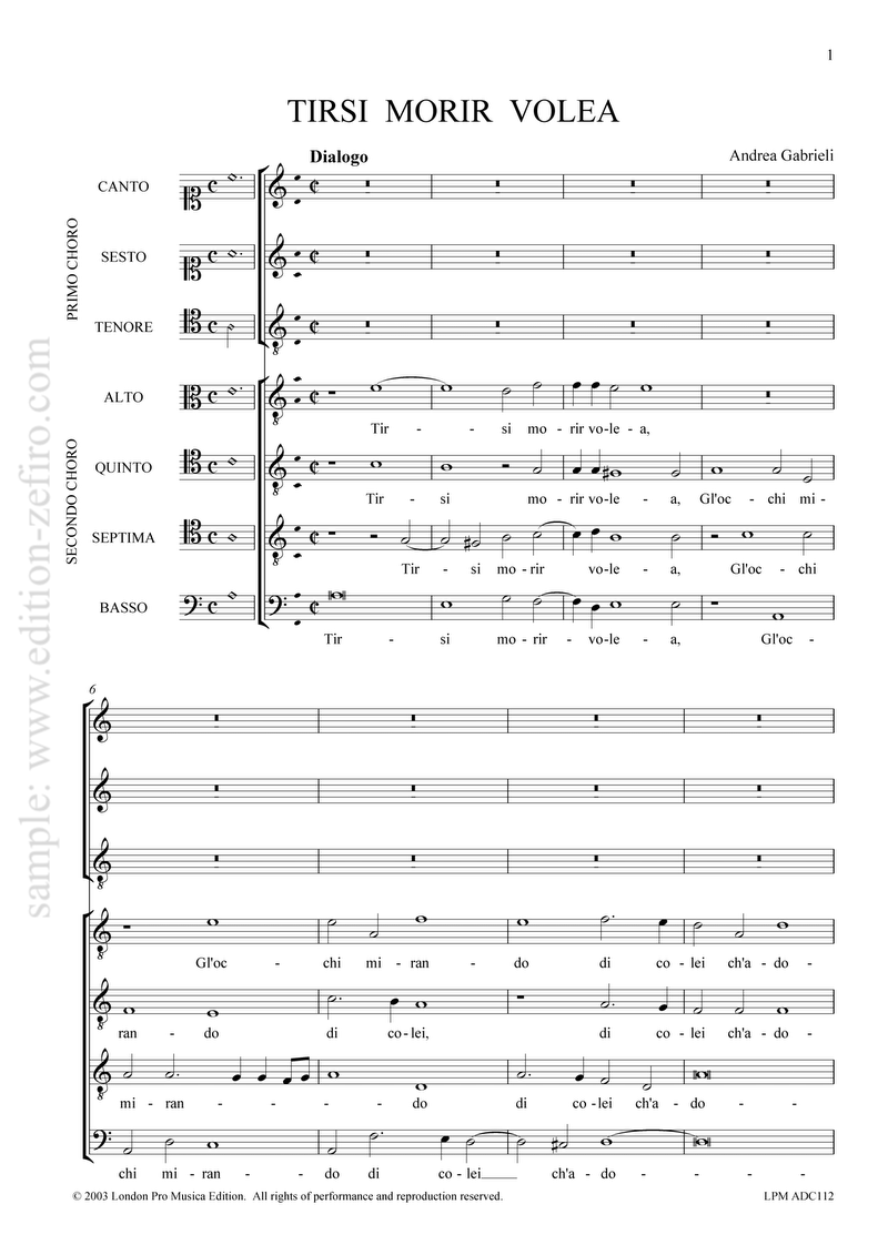 Andrea Gabrieli’s Dialogo “Tirsi morir volea” is one of three 7-part madrigals printed after the Concerti di Giovanni e Andrea Gabrieli, (Venice 1586).